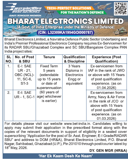 Candidates willing to apply may submit their application in the prescribed format along with the copies of the relevant documents in support of eligibility in a sealed cover superscribing “Application for the post of Sr. Asst. Engineer, E-I Grade/RADAR SBU” and address to DGM (HR&A), Bharat Electronics Limited, P.O. Bharat Nagar, Sahibabad, Ghaziabad (U.P.), Pin 201010 through post/courier latest by 18th May 2026.