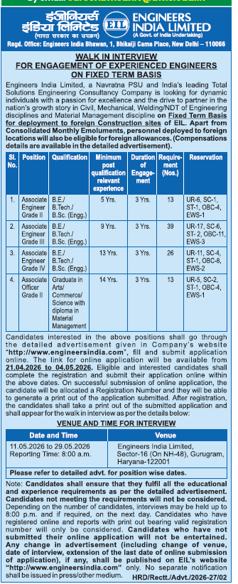 Tags: EIL Engineer Recruitment 2026 , EIL Engineer Online Form 2026 , EIL Engineer Vacancy 2026 , EIL Associate Engineer & Associate Officer Recruitment 2026