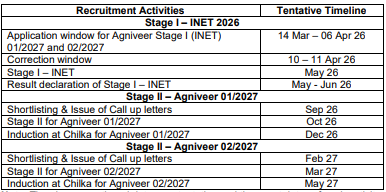 Selection Process. Stage-I INET 2026 exam will be conducted in May 26. Based on the marks obtained in Stage I – INET, candidates will be will be shortlisted for the stage II of Agniveer 01/2027 and 02/2027 separately. The tentative timeline for recruitment is as follows: