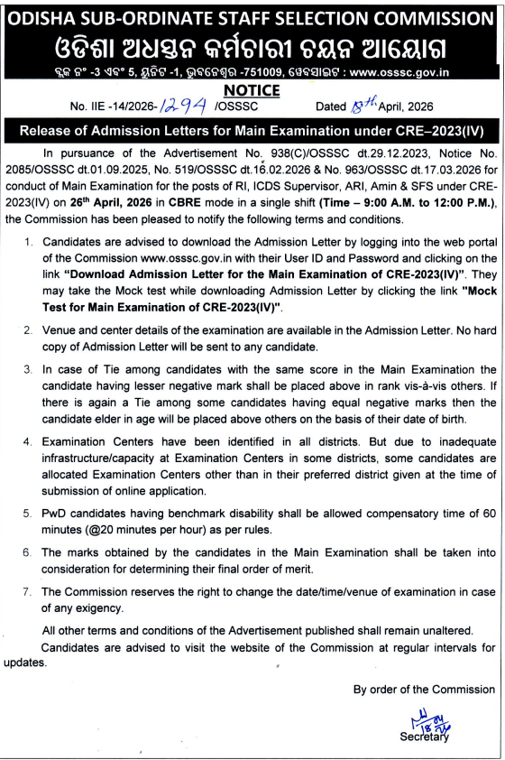 18/04/2026Download Mains Admit Card :Notification No. IIE-14/2026-1294/OSSSC dated - 18.04.2026 ----- Release of Admission Letters for Main Examination under CRE-2023(IV) - Click Here