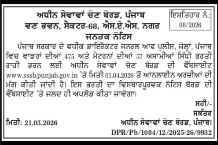 Tags: PSSSB Jail Warder and Matron Bharti 2026 , PSSSB Jail Warder and Matron Online Form 2026 , PSSSB Jail Warder and Matron Vacancy 2026 , Punjab Jail Warder and Matron Bharti 2026