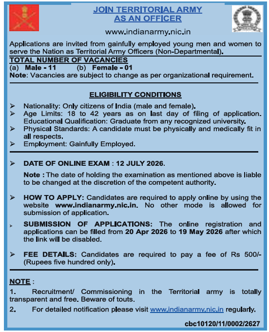 Tags: Territorial Army Officer Recruitment 2026 , Territorial Army Officer Online Form 2026 , Territorial Army Officer Vacancy 2026 , Territorial Army Officer Recruitment 2026